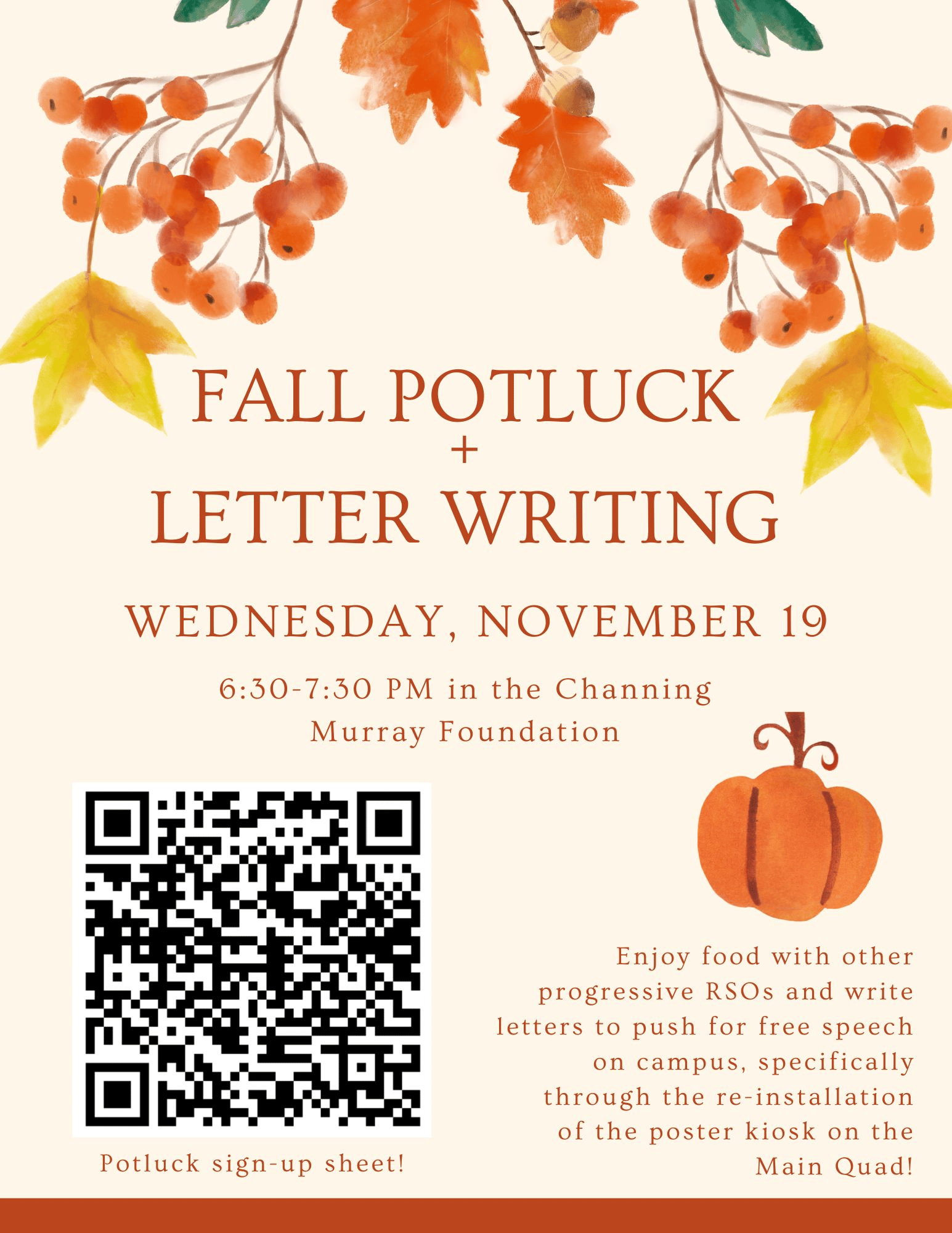 Instead of our normal working groups, we’ll be hosting a potluck! We’ll be writing letters to support the return of a public signpost for students. All of the invited organization will present on what they do and what they’ve achieved this year. Come write letters and learn about our friends around campus!